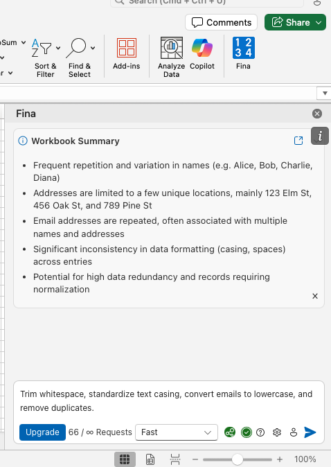 Tell Fina what you need in plain English and watch as it transforms your spreadsheet work.